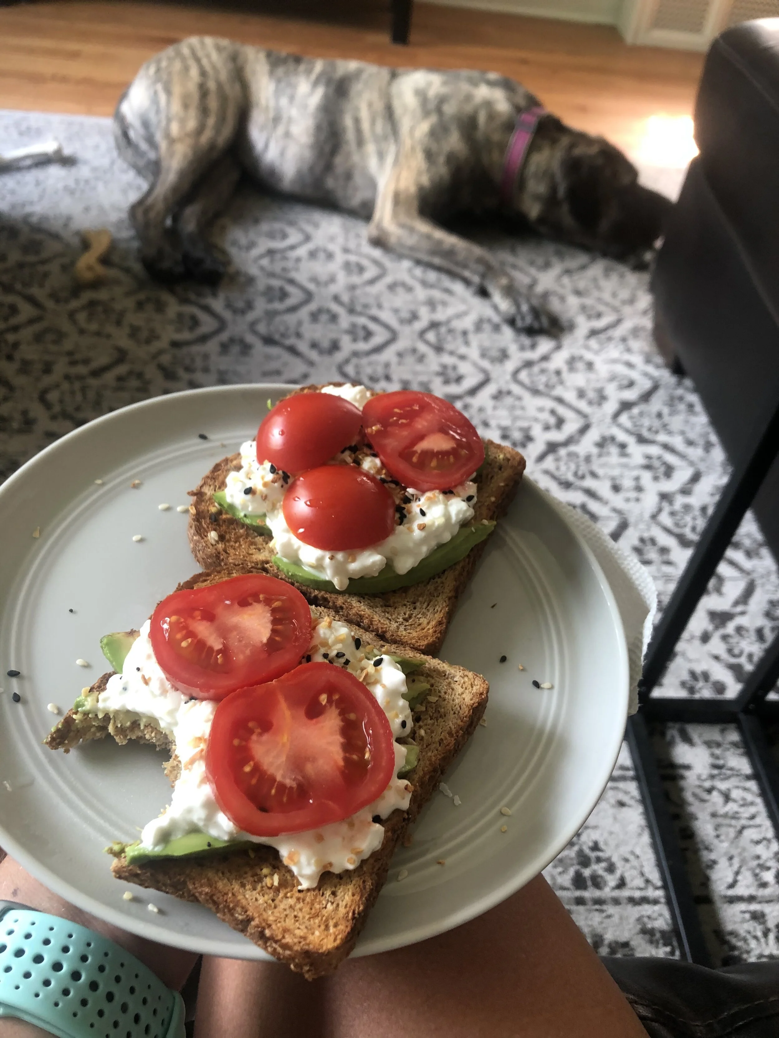 ½ cup cottage cheese with cherry tomatoes and ¼ avocado diced into it and paired with whole wheat pita or sprouted grain toast (as pictured with my dog in the background)
